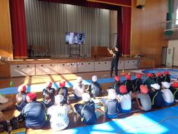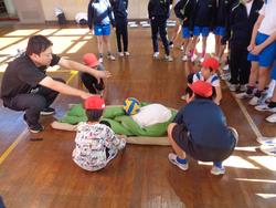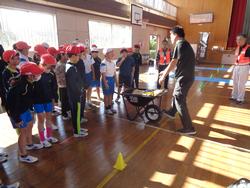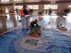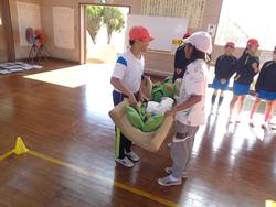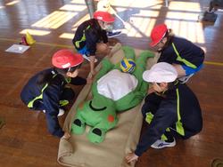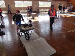 4年生は、常総市小中学校防災学習として、常総市の方々に来校していただき防災スポーツを行いました。災害でのあぜ道や段差を想定して一輪車で物を運んだり、マットで負傷した人を運ぶ訓練や水難時の救助などをしたり、タイムを競い合いながら活動しました。最後に防災についてのクイズ(水や食料の備蓄や家具の置き方など)に挑戦しました。