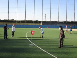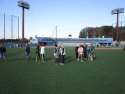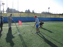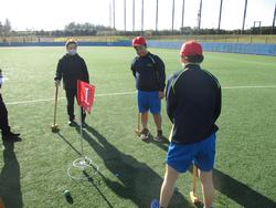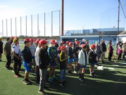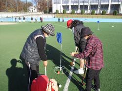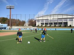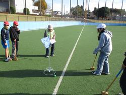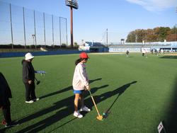 社会福祉協議会 飯沼支部の世代交流事業の一環として、石下総合運動公園で、本校6年生がグラウンド・ゴルフ大会に参加しました。一般の方々と、クラブでボールを打ち、ホールポスト内に静止するまでの打数を競いました。秋晴れのさわやかな天候のもと、地域の方々との交流を深めることができました。