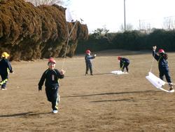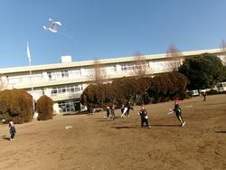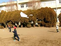 1年生の生活の授業では、「ふゆをあそぼう」の学習で、授業で作った凧をあげました。風の向きを考えたり糸が緩まないように調節したりしながら、安全に気をつけて凧あげをしました。