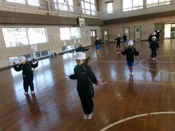 1年生の体育では、縄跳びの学習をしています。準備運動をした後に、前跳び、後ろ跳び、かけ足跳び、交差跳び、あや跳びの練習をしました。最後に2グループで大縄跳びの練習をしました。