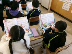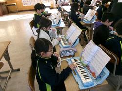 2年生の音楽では、「汽車は走る」という曲を鍵盤ハーモニカで演奏しました。汽車の走る様子を思い浮かべ、楽譜をよく見ながら演奏をしていました。