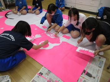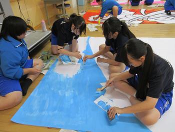 体育館の後ろからでも目を引くデザインを心掛け、細部は、ポップな色合いでインパクトある作品にしています。部員全員が一丸となって作業を分担しています。今年はどんな絵が完成するのかとても楽しみです。