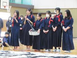 今日はお隣の水海道第一高等学校書道部の皆さんをお迎えして、書道パフォーマンスを披露していただきました。日頃の部活動についての紹介の後、全校児童が見守る中、部員の方が大きな筆を持って大きな用紙に力強く文字を書きました。最後に仕上がった「前進」の文字を囲んで、記念写真を撮りました。子どもたちにとって、貴重な体験となりました。ありがとうございました。