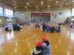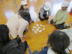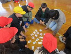 縦割り班活動の様子です。今日は3年生と6年生が一緒に遊びました。トランプを使ってカルタをしました。班ごとに円く座ってトランプを並べます。代表の6年生がマイクで全部の班に向けて「赤の3!」「黒の5!」と言うのに合わせて一斉にカードを取ります。3年生相手に手加減なしに本気で挑む6年生、そんな6年生に負けじと食らいついていく3年生、3年生にカードを譲ってあげている6年生、いろいろな姿が見られました。
