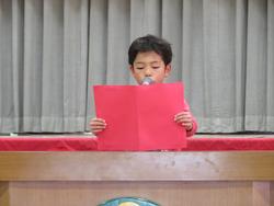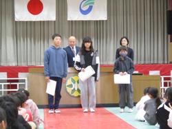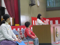 表彰式と修了式を行いました。修了式では、3人の代表児童が、今年度がんばったことや来年度に向けての目標を堂々と発表しました。その後、各クラスの代表者が修了証を受け取りました。どのクラスも立派な態度でした。誰もが、この一年間の自分自身の成長を感じたことと思います。校長先生からは、「修了証」とはどういうものであるか、の説明がありました。また、今年度の目標である「笑顔」で一年を過ごせたかどうか、暖かい春を迎えたので活動的になっていろいろなことをしましょう、といったお話がありました。
