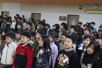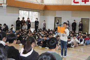 在校生からお世話になった6年生へ、感謝の思いを込めて「呼びかけ」と歌「僕らまた」を贈りました。