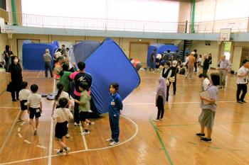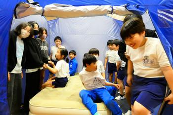 次に、縦割り班ごとに避難所の設営を行い、テントの設置や簡易ベッドの作り方を学びました。テントの大きさやベッドの感触を実際に体験することもできました。