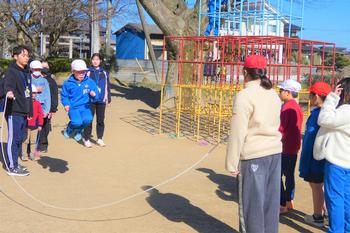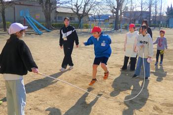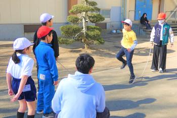 上級生が下級生に縄に入るタイミングを優しく教えたり、下級生が跳びやすいように縄を丁寧に回したりするなど、相手のことを考えながら上手にリードし、楽しく活動する姿が見られました。