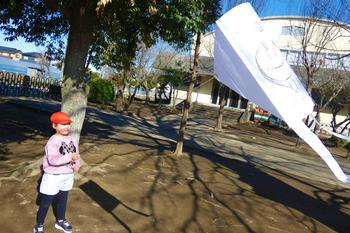 ちょうどよい強さの風が吹いており、子供たちは空高く上がるたこを見上げ、とっても楽しそうでした。はじめのうちは、たこを上げようと一生懸命に走り続けていた子も多く見られましたが、次第に風の向きを感じ取りながら、止まったままでも上手にたこをコントロールできるようになってきました。