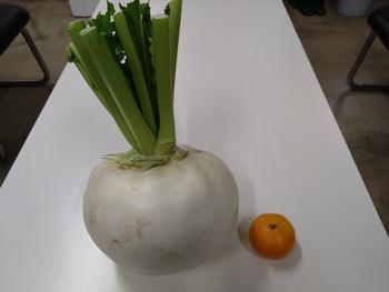 ~ 給食パクパク週間・茨城をたべようWeek ~ 11月18日(火) ごはん 牛乳 いなだの色付け ごぼうのピリ辛味噌炒め かぶのみぞれ汁 今日の常総市産の食材は、ごはん、にんじん、かぶ、ねぎ、とうがんです。茨城県産食材はいなだ、豚肉、鶏肉、豆腐、牛乳、ピーマン、ごぼう、しめじ、こんにゃくです。 今日の給食の魚は「いなだ」です。いなだには、みなさんの頭の働きをよくしたり、血をサラサラにして体を元気にしてくれたりする「DHA」という栄養がたっぷり入っています。また、いなだは大きくなるにつれて名前が変わる「出世魚」という、おめでたい魚です。今日は中くらいの大きさの「いなだ」ですが、もっと大きくなると「ぶり」という名前になります。味にクセがない魚で、ごはんによく合う味付けです。魚が苦手な人も、一口はチャレンジしてみましょう。 今日の「かぶのみぞれ汁」には常総市産のかぶが使われていますが、常総市の農家の方が納品してくださったかぶは、とっても『おおきなかぶ』でした!隣に並べたみかんとは比べ物にならないくらいの大きさですね! |