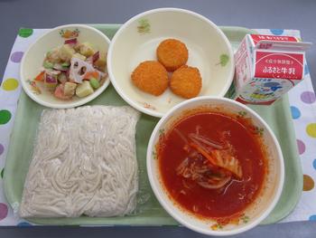 11月10日(月) 塩トマトうどん(ソフトめん 塩トマトスープ) 牛乳 かまぼこフライ(2.2.2.3) 秋野菜サラダ(ごまドレッシング) 今日のソフトめんのスープは新メニュー「塩トマトスープ」です。塩ラーメンのスープに、真っ赤なトマトをたっぷり入れました。トマトが入ることで、スープにさわやかな酸味とコクが加わっておいしくなります。トマトの赤い色の素は「リコピン」という成分で、みんなが病気に負けない、強い体を作るのを助けてくれます。ビタミンCも多く、かぜをひきにくくしたり、お肌やのど、鼻の粘膜を強くしたりしてくれます。そして、トマトには「うま味」成分がたくさん!このうま味のおかげで、塩分が控えめなスープでも、しっかりおいしく感じることができます。トマトなどの「うま味」が強い食材を使うと、少ない塩分でも味に満足できるため、「減塩」に役立ちますね。お味はいかがでしょうか? |