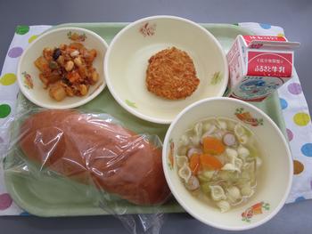 11月26日(水) コッペパン(りんごジャム) 牛乳 豆乳コーンコロッケ ごぼうサラダ ウインナーと白菜のスープ 今日はコッペパンにりんごジャムをつけて食べましょう。ジャムは、果物と砂糖を煮詰めて作られます。とれる季節が決まっている果物でも、ジャムにすることで腐りにくくなり、長い期間楽しむことができます。また、果物に含まれる「ペクチン」という成分は、煮詰めることで体に吸収されやすくなり、おなかの調子を整えるのを手伝ってくれます。 実は、秋から冬にかけて、りんごがおいしい時期です。「1日1個のりんごは医者いらず」ということわざがあるくらい、りんごにはみんなの体を元気にするパワーがいっぱい詰まっています。給食ではりんごジャム、おうちでは旬のりんごをおいしくいただきましょう。 |