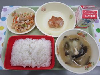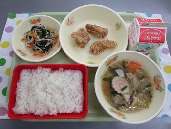 11月28日(金) ごはん 牛乳 鶏肉の青のり揚げ(2.2.2.3) ナムル(塩中華ドレッシング) ワンタンスープ クイズ!次の料理に共通する食べ物は何でしょう?「お好み焼き、たこ焼き、焼きそば、ちくわの磯辺揚げ」…正解は「青のり」です。青のりは、おにぎりに巻く黒いのりと同じ「海藻」の仲間です。小さいけれど、体によい栄養がたくさん詰まっています。まずは「カルシウム」です。牛乳と同じように、みなさんの骨や歯を丈夫にしてくれます。青のりの風味や磯の香りは、食欲をそそるいい香りがしますね。また、海藻には「うま味」が多く含まれているので、塩味を抑えてもおいしく感じられる効果があります。今日の給食の青のり揚げはいかがでしょうか?下膳された容器の中は空っぽのクラスもあり、おいしく食べてくれてうれしいです。 |