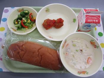 ~読書週間献立 10/27~11/9は読書週間!~ 『給食アンサンブル2』からミートボール/クリームシチュー 11月5日(水) 黒糖パン 牛乳 ミートボールのトマト煮 ブロッコリーサラダ(イタリアンドレッシング) クリームシチュー 今月は、常総市や茨城県でとれた食べ物が給食にたくさん登場します。みなさんが住んでいる土地(常総市や茨城県)でとれた食べ物のことを「地場産物」といいます。地場産物を食べることには、3つのよいことがあります。①近くの畑や田んぼでとれたばかりの野菜やお米を使っているので、新鮮でおいしい!②だれが、どこで、どんな風に作っているのかが分かるので、安心!③地場産物を食べることで、常総市や茨城県で農業をがんばっている農家さんたちを応援! みなさんの「おいしい!」という笑顔が、農家さんの元気の源です。給食で地場産物を見つけたら、「この野菜は常総市で育ったんだな」と、作ってくれた人に感謝しながら、残さずいただきましょう。 ※今日の常総市産食材:きゅうり、はくさい、さつまいも |