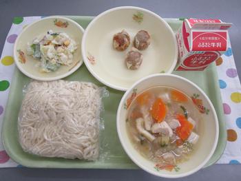 12月1日(月) 鶏塩うどん(ソフトめん 鶏塩汁) 牛乳 肉シューマイ(2.2.2.3) さつまポテトサラダ 12月の給食が始まりました。冬本番を迎え、体が冷え込みやすい時期です。寒いと手を洗うのが面倒になりがちですが、かぜや胃腸炎を防ぐには、石けんを使った丁寧な手洗いが一番大切です。寒さに負けない丈夫な体をつくるために、手洗いうがいをして、給食をしっかり食べましょう。 今日はシューマイです。シューマイは、お肉や野菜を混ぜた具を、薄い皮で包んで蒸した中華料理の一つです。ここで、シューマイクイズ!シューマイが日本で一番たくさん食べられている都道府県はどこでしょうか?…正解は「神奈川県」です。神奈川県の横浜市にある中華街では、おいしいシューマイがたくさん売られています。今日のシューマイは、蒸さずに焼いています。焼くことで、ふっくらとした食感からかみごたえのある食感に変わりますね。 |