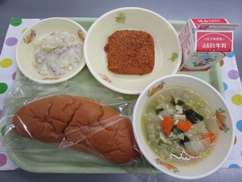 11月3日(水) 黒パン 牛乳 ハムカツ ポテトのチーズ煮 ABCスープ 昨日に引き続き、今日の給食も豊岡小の6年生が考えた献立です。献立のテーマは「栄養たっぷりいろどり献立」です。今が旬の小松菜を使い、みなさんが好きなアルファベットマカロニを入れたスープにして、野菜がたくさん食べられる工夫をしています。また、ポテトのチーズ煮からカルシウムをしっかりとることができます。来週も6年生が考えた献立が登場します。おいしい献立を考えてくれた6年生に「今日の給食おいしかったよ」と感想を伝えてみてくださいね。 |