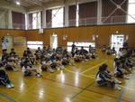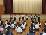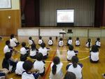 まず、3・4年生と5・6年生の「JOSO☆ハッピー体操」の映像をスクリーンで映し、みんなで鑑賞しました。その後に、1・2年生が一人一人見どころを発表し、「JOSO☆ハッピー体操」を披露しました。6年生が1・2年生一人一人の名前が入った推し団扇を作成し、応援にも気合いが入りました。かわいい1・2年生の発表を見て、自然と掛け声がかかり、みんな笑顔で応援していました。そして最後に、3~6年生から1・2年生に向けてエールが送られました。