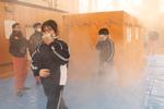 それをふまえて、煙の充満するテントの中に入り、そこから避難する体験を行いました。