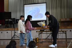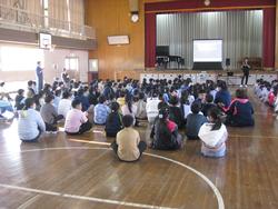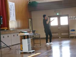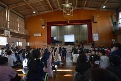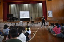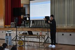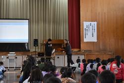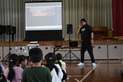 本日、全校児童と希望する保護者の皆様を対象に、本校の卒業生でイバラッパーとして活躍している青木智也さんを講師にお招きして、「ラップで学ぶ! いばらきことば集会」を開催しました。青木さんは、県内各地の様子を茨城弁を交えたラップで表現し、様々なイベントに出演したり、ラジオのパーソナリティをしたりしています。講話では、茨城の方言のクイズやラップの作り方などを交えながら、実際にたくさんのラップを聞かせていただきました。今日の集会を通して、茨城県の言葉や文化について楽しく学ぶことができました。