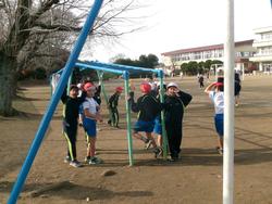 毎週火曜日と木曜日の業間休み時間に、体つくりの一環として持久走の練習を行っています。準備運動をした後に、グラウンドを低・中・高学年の3つのコースに分けて自分のペースで3分間走ります。走り終わった後は、何周走れたかを記録しました。