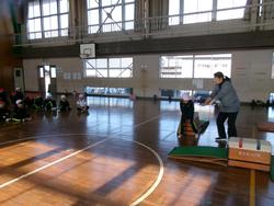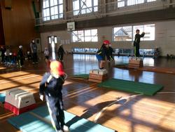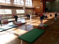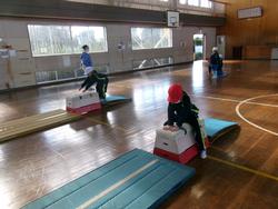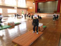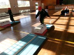 1年生の体育では、跳び箱の学習をしています。踏切板で踏み切り、跳び箱の上に立ち、最後にジャンプしてマットに着地をする練習をしました。後半は、踏み切った後に跳び箱に両手をついてすわり、マットにジャンプをする練習をしました。両足で踏み切ること、体全体を使ってジャンプすることを大切にしながら、練習に取り組んでいました。