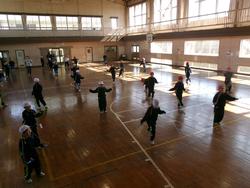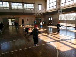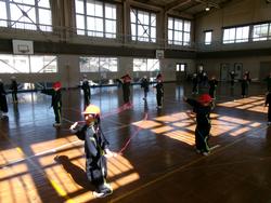 1年生の体育では、縄跳びの学習をしています。準備運動をした後に、前跳び、後ろ跳び、かけ足跳び、交差跳び、あや跳びの練習をしました。最後に2グループで大縄跳びの練習をしました。