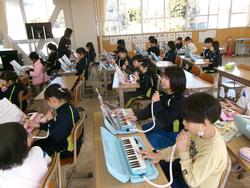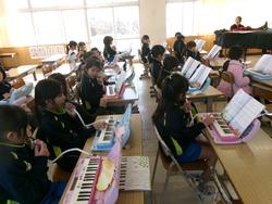 2年生の音楽では、「汽車は走る」という曲を鍵盤ハーモニカで演奏しました。汽車の走る様子を思い浮かべ、楽譜をよく見ながら演奏をしていました。