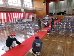 明日の卒業式に向けて、5年生は卒業式の準備を行いました。体育館や昇降口など、役割分担ごとに、椅子を並べたりじゅうたんを敷いたり掃除をしたりしました。卒業式の式場がきれいに整いました。