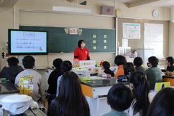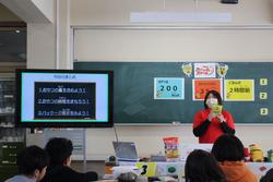 12月16日(火) カルビー株式会社の食育出前授業を実施しました。講師の方から「おやつの役割」「おやつの賢い取り方」についての話がありました。おやつには「食事で不足しているエネルギーの補給ができる」「おやつは心のいやし(おやつを食べることで心が穏やかになる)」の役割があることの説明があり多くの子どもたちもうなずいていました。また、「1日200㎉」「ご飯の2時間前までにとる」という「おやつの賢い取り方」や、食物アレルギー対策として、商品に記載されているパッケージ表示を見ること等の重要性も教えていただきました。