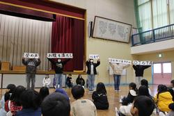 12月24日(水) 2学期の終業式を行いました。1,4,6年生の代表児童が2学期の振り返りを発表しました。2学期頑張ったこととして、「運動会のダンス」「図工の創作活動」「家庭学習」を挙げていました。また6年生の児童からは、「休み時間の外遊びを通して他学年の児童との交流を深められたこと」、「自分たちで考えて委員会活動の新しい取組を進めたこと」などの発表もありました。そして、小学校最後の日々を家族や先生、地域の方に感謝をすることを忘れずに一日一日を大切にしていきたいとの今後の決意を堂々と伝えていました。学校長からのあいさつの中では、2学期の子どもたちの努力を短歌に表し、本校のキャラクターである「石下丸」とともにその頑張りを称え合いました。
