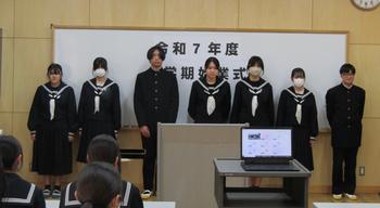 1月8日(木)に3学期始業式と生徒会役員任命式を行いました。今学期は各学年の集大成となる学期です。それぞれの目標達成に向けて、全力で取り組んでいくことを期待しています。また、あわせて行われた生徒会役員任命式では、旧役員から引き継いだ「学校をよりよくしたい」という思いを胸に、力強い一歩を踏み出しました。