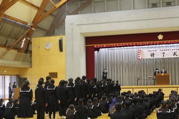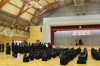 3月24日(火)修了式が行われました。1年生はみな、厳かな雰囲気の中、式に臨みました。1年生による作文発表では、「言語を学ぶことは人との交流にも自分の学力向上にもなります。」と、1年間を振り返り、堂々と挨拶をすることができました。
