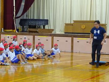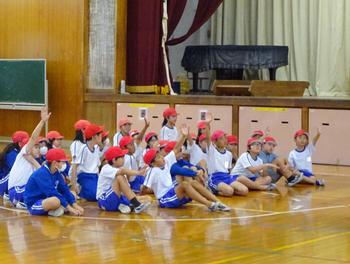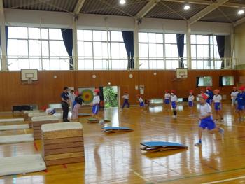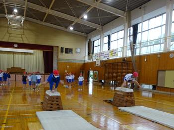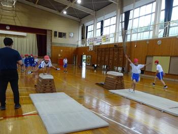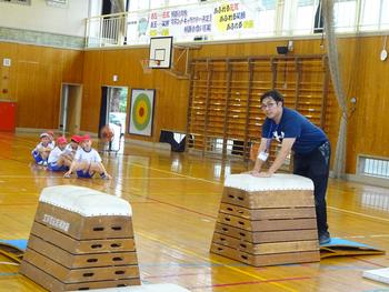 両足でしっかりふみきる練習をした後、手をつく位置を確かめながら、開脚跳びにチャレンジしました。