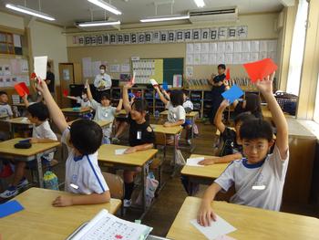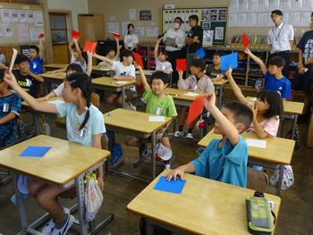 イエスなら青色のカード、ノーなら赤色のカードを選びます。