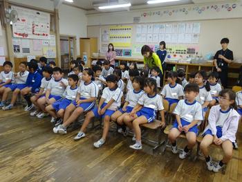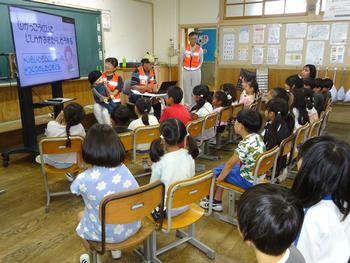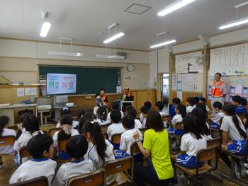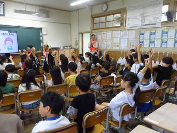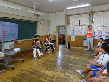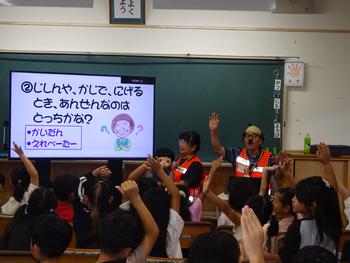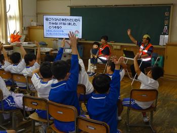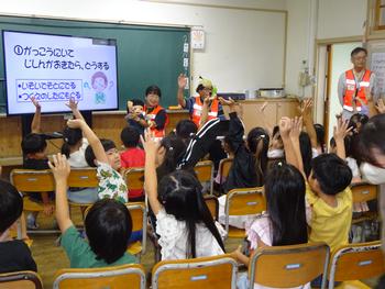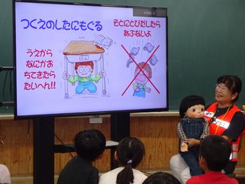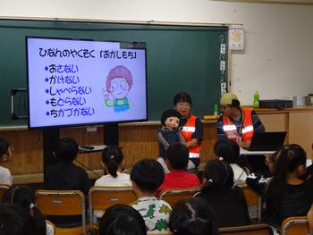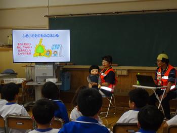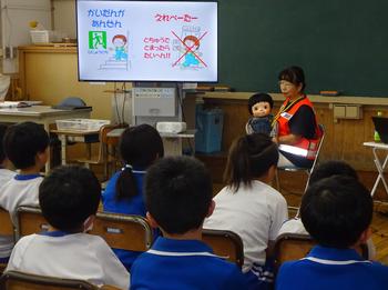 今日、1年生と2年生の教室で「けんちゃんとまなぼう こどもぼうさいきょうしつ」を行いました。