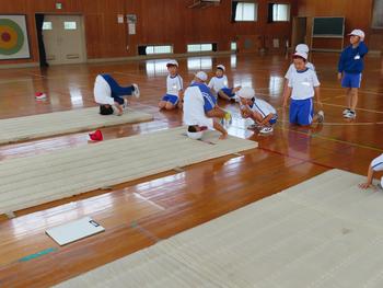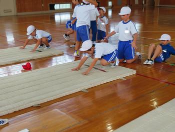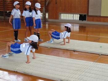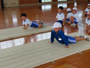 2の2、体育「マットを使った運動遊び」の授業の様子です。