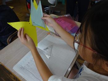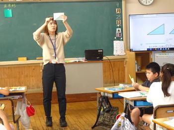 長方形と正方形の紙を切ってできた三角形から、その三角形の特徴を調べる学習をしていました。