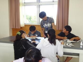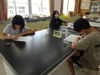 実験は、「ふる」「湯につける」「火の付いた線香を入れる」「石灰水を入れる」の4つの方法で行いました。