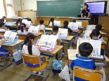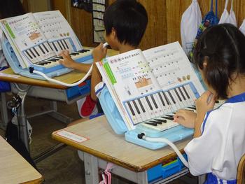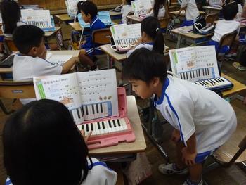 ペアで鍵盤ハーモニカのふき方を確かめる姿も見られました。