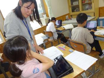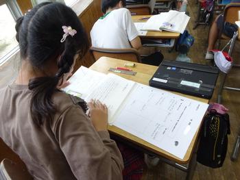まずはワークシートを活用して一人読みを行い、その後、自分の考えをタブレットPCに書き込みました。