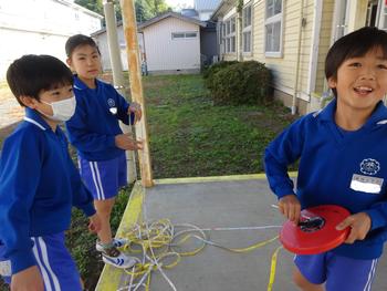 学校にあるいろいろなものの長さをまきじゃくではかりました。