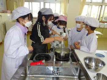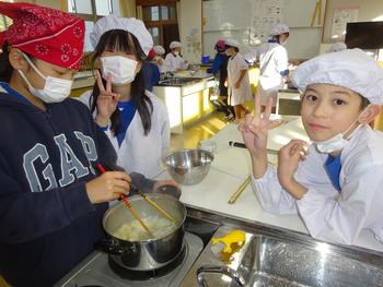 「だしの役割を知り、おいしいみそ汁の作り方を知ろう」をめあてに、5年2組が調理実習を行いました。
