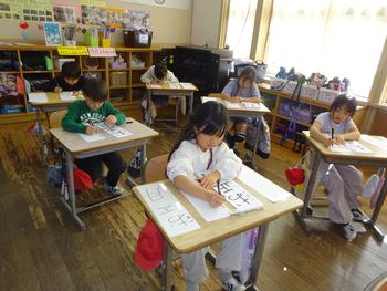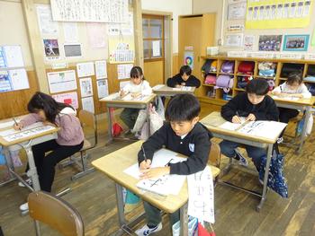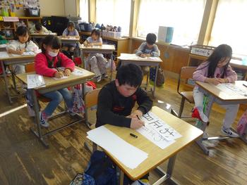 姿勢を正し、ていねいに「お正月」の書き初めをしました。
