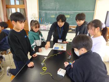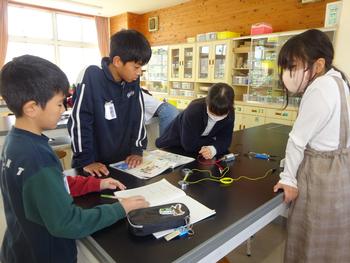 回路を作り、電流を流した時の極のでき方を方位磁針の針の向きで調べました。