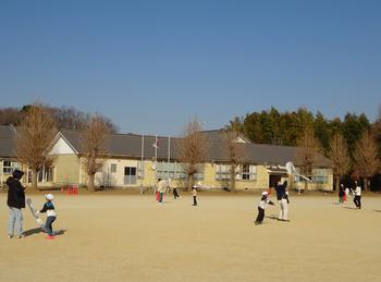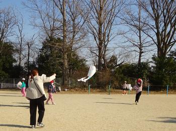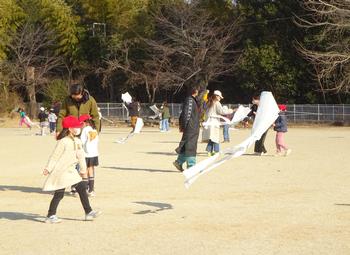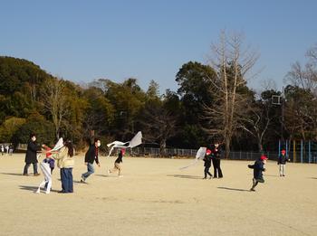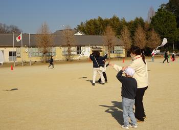 教室で凧づくりが終わった後、晴天の下で、広い校庭に出て、親子でコミュニケーションを図りながら、楽しそうに凧あげをする姿が見られました。