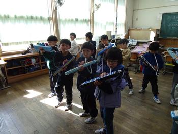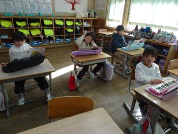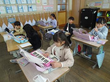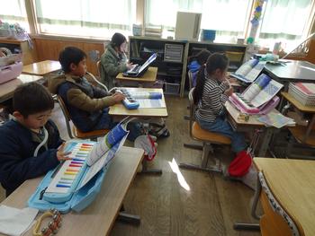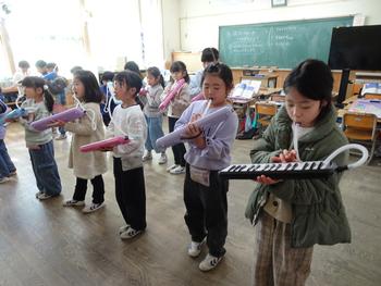 今までに学習した3つの合奏曲を、鍵盤ハーモニカやすずを使って演奏していました。