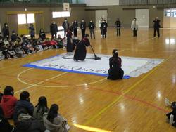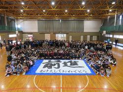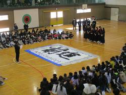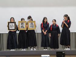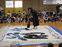 今日はお隣の水海道第一高等学校書道部の皆さんをお迎えして、書道パフォーマンスを披露していただきました。日頃の部活動についての紹介の後、全校児童が見守る中、部員の方が大きな筆を持って大きな用紙に力強く文字を書きました。最後に仕上がった「前進」の文字を囲んで、記念写真を撮りました。子どもたちにとって、貴重な体験となりました。ありがとうございました。