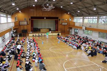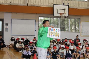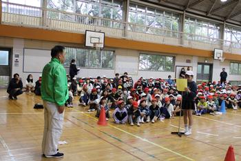 体育館での全体指導では、「お・か・し・も・ち」(おさない・かけない・しゃべらない・もどらない・ちかづかない)の合言葉を再確認し、