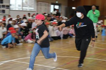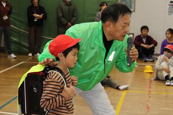 さらに、不審者に遭遇した場合の逃げ方について、各学年の代表児童が訓練に参加し、ランドセルを脱ぎ捨てて速やかに逃げる練習に取り組みました。