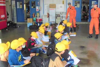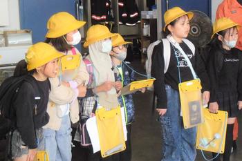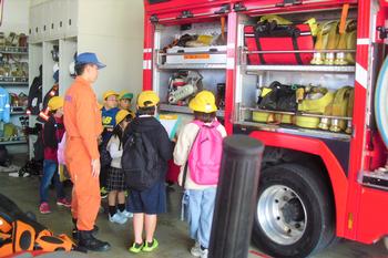 また、消防署では、様々な消防自動車の設備に驚いたり、出動要請があった際の素早い着替えをカウントを取りながら見学したりしました。